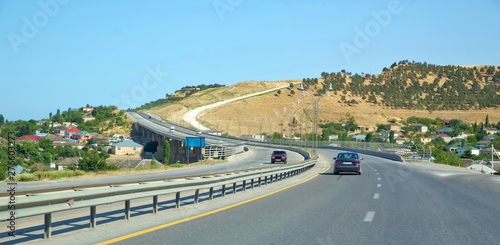 © Adil, Naklejka premium Yellow mountains. Road trip, fun car ride on desert mountain road in the western countryside. Bridge . The path to the car.