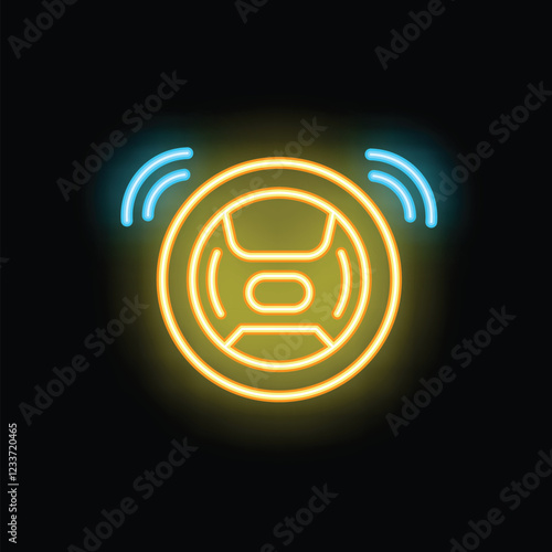 © ylivdesign, Obraz premium Yellow neon sign of a modern robotic vacuum cleaner cleaning the floor