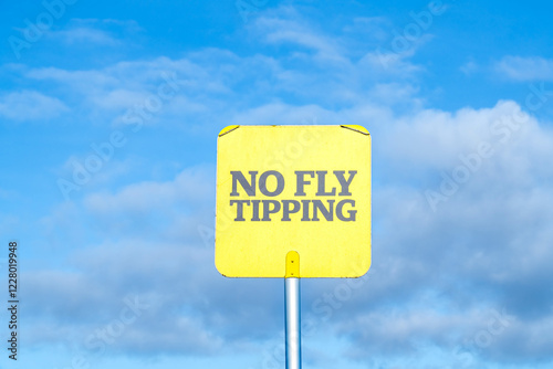 © Richard O'Donoghue, Naklejka premium Yellow "No fly tipping" sign, no illegal dumping due to health and environmental effects
