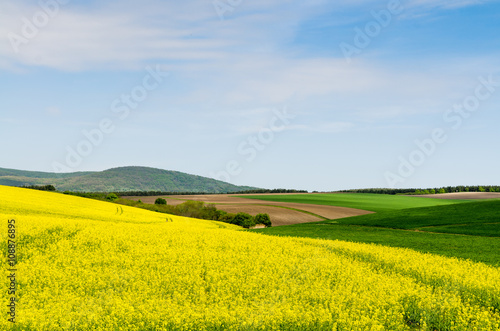 © klagyivik, Fototapeta premium Yellow oilseed rape field under the blue sky with sun