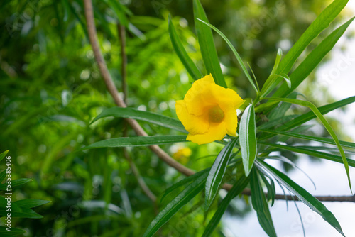 Naklejka premium Yellow oleander flower on tree with green leaves