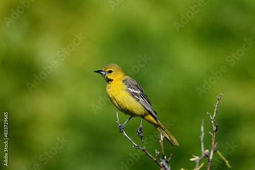 Obraz premium Yellow Oriole Perched Tree Top On Green