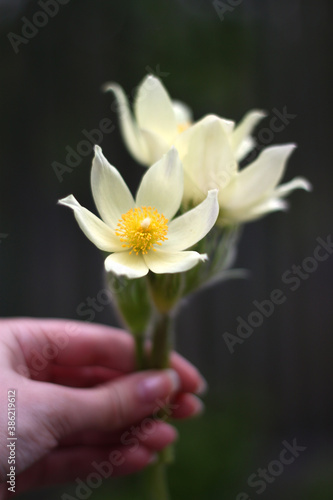 © dreamloud, Fototapeta premium yellow pasque flowers bouquet in hand on dark background in spring