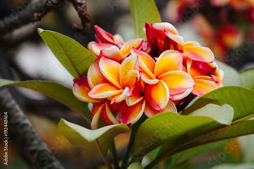 © Jeerayut, Fototapeta premium Yellow-pink Frangipani flowers with blur background