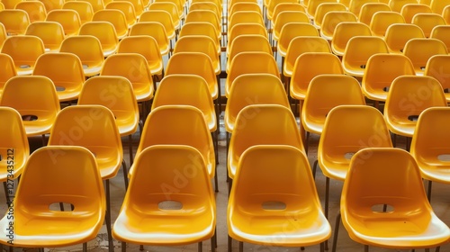 Naklejka premium Yellow plastic chairs with metal legs, arranged in rows, demonstrate the...