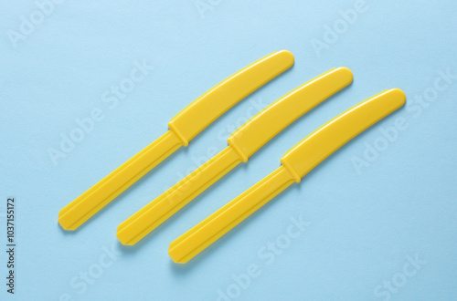 © splitov27, Obraz premium Yellow Plastic knives on blue background