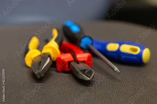 Fototapeta premium yellow pliers tool set red nippers and two blue screwdrivers