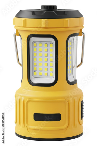 © Creda, Fototapeta premium Yellow portable camping lantern with light panel and metal handle isolated on transparent background