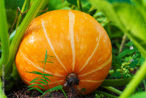 © evannovostro, Obraz premium Yellow pumpkin grows in the garden on a sunny day