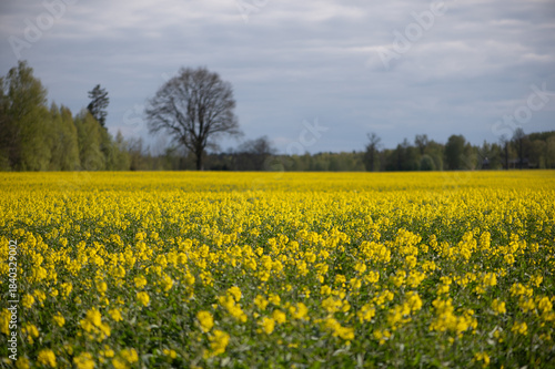 Obraz premium Yellow Rapeseed Field Under Spring Sky in Latvia