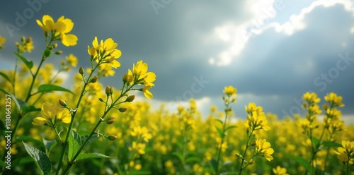 © Sutasinee, Fototapeta premium Yellow rapeseed flowers swaying gently in the breeze amidst a grey and foreboding sky, plant life, branch