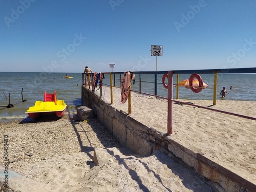 © Zhanna, Obraz premium Yellow red catamaran near the pier on the beach