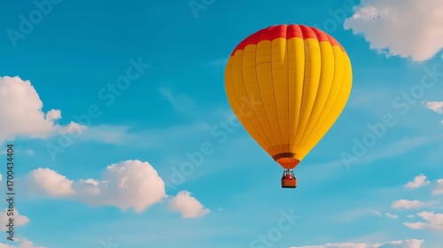 Fototapeta premium Yellow Red Hot Air Balloon Soaring in Blue Sky with Clouds