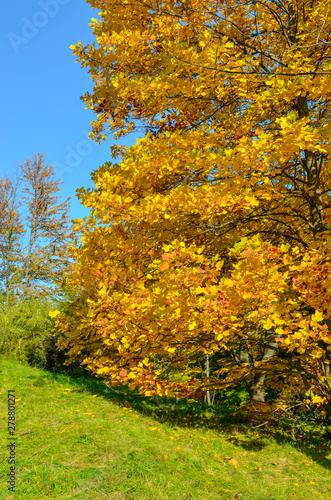 © KatyPavliuk, Naklejka premium Yellow red-orange yellow-green leaves of magnolia, Nature concept for design