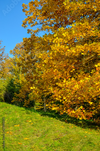 © KatyPavliuk, Naklejka premium Yellow red-orange yellow-green leaves of magnolia, Nature concept for design