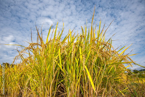 © 대철 신, Fototapeta premium Yellow rice ears ripening golden in autumn rice paddies.
