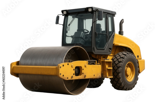 © OMD, Fototapeta premium Yellow road roller with large metal drum and cabin, used for compacting asphalt or soil in construction projects, on transparent background.