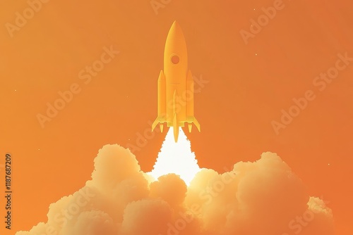Obraz premium Yellow rocket launching through orange clouds.