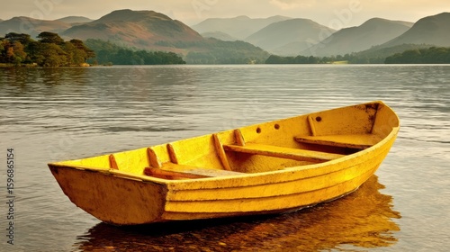 © Zulfa, Naklejka premium Yellow Rowboat Floating on Calm Lake Water with Distant Mountains