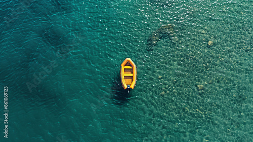 Naklejka premium yellow roweing boat on the water seen from drone foto as top view