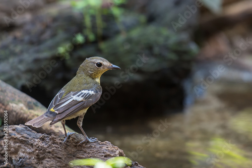 © sunti, Obraz premium Yellow-rumped Flycatcher female By the pond in nature