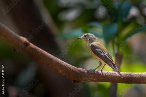 © sunti, Fototapeta premium Yellow-rumped Flycatcher female on branch in nature