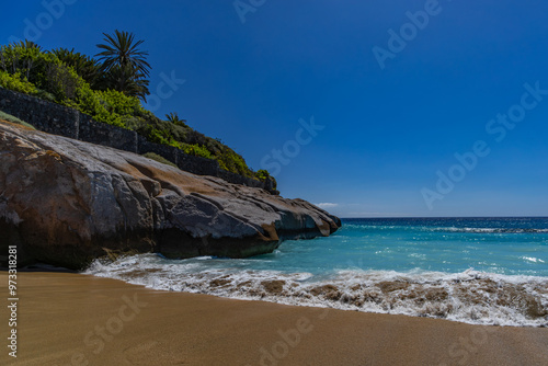 © dominikspalek.pl, Fototapeta premium Yellow sand beach, dangerous high waves, rough Atlantic Ocean, famous Playa del Duque Teneriffe Costa Adeje
