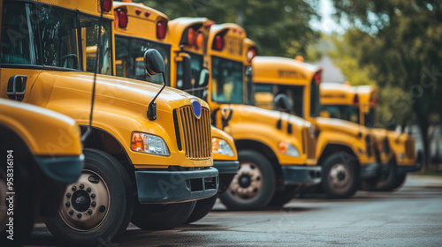 © พงศ์พล วันดี, Obraz premium Yellow School Buses Lined Up in Front of School Ready for First Day