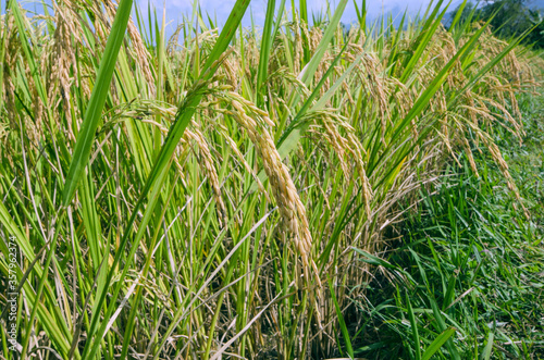 Fototapeta premium Yellow seeds and green leaves of ripe rice
