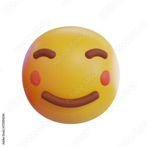 © Aira, Fototapeta premium Yellow Smiley Face With Red Cheeks And Closed Eyes Expressing Contentment With Subtle Smile And Brown Eyebrows Set Against A Transparent Background