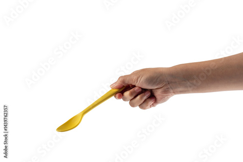Fototapeta premium Yellow spoon and hand isolated on transparent background.