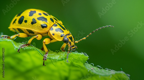 Fototapeta premium Yellow spotted beetle on a green leaf in nature