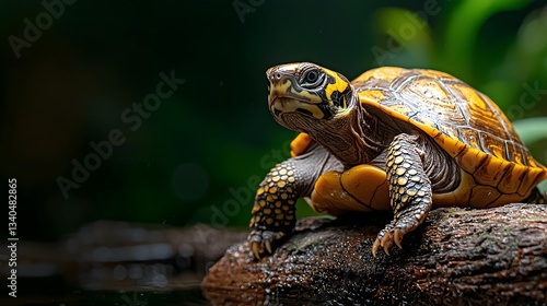 © Heng Heng - AI Stock, Obraz premium Yellow Spotted River Turtle Resting on Log Near Slow Moving Stream Its Eyes Gazing at the Calm Water in a Peaceful Scenic Nature Setting