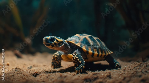 © Agen stock, Obraz premium Yellow-spotted tortoise walking on sand, aquatic plants background, nature documentary