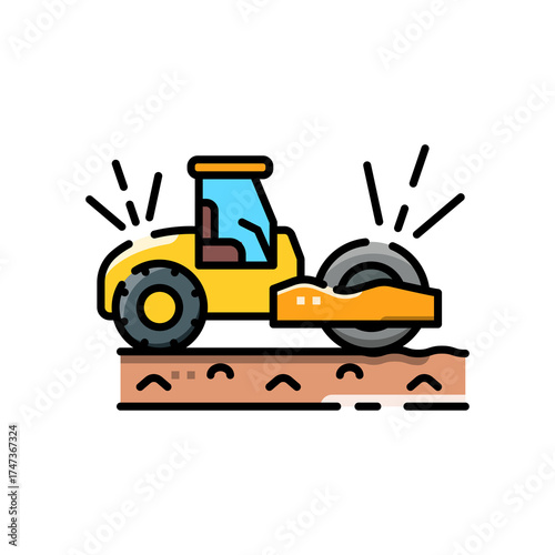 Naklejka premium Yellow Steamroller Compacting Soil and Ground Construction Vehicle Icon with...