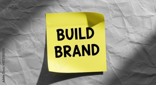 Obraz premium Yellow sticky note with the words Build Brand on a textured grey paper surface with light shadows.