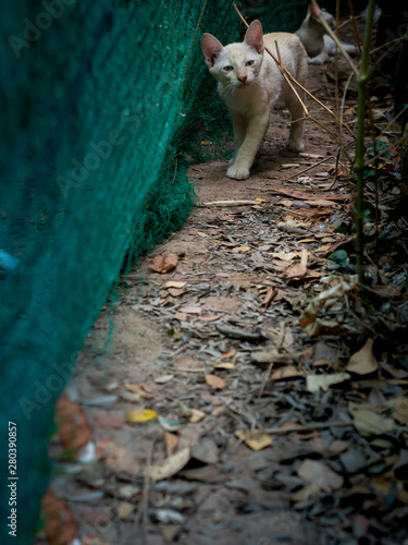 © wichatsurin, Fototapeta premium Yellow Striped White Kitten Walking