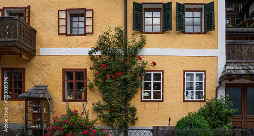 Naklejka premium Yellow stucco house in Hallstatt, Austria with green shutters, wooden balcony, and blooming red climbing roses around the windows, surrounded by ornamental shrubs and decorative garden items in summer