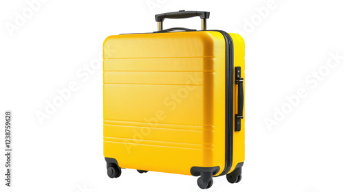Fototapeta premium Yellow suitcase on wheels standing upright on transparent background