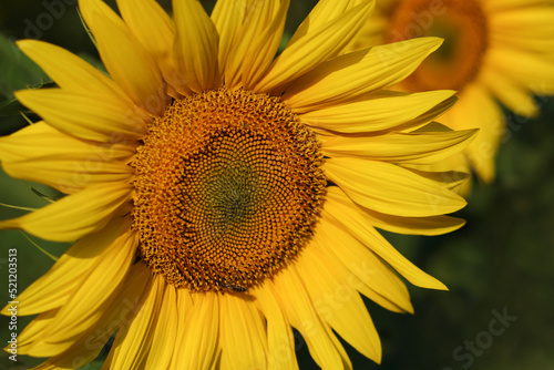 © Mariia, Fototapeta premium Yellow Sunflower close up. Agricultural field with sunflowers for background. Perfect wallpaper. Sunflower blooming. Sunflower natural background. Organic Farming. Gardening. Nature concept
