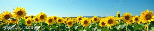 Fototapeta premium Yellow sunflower fields in a serene blue landscape, serene, blue