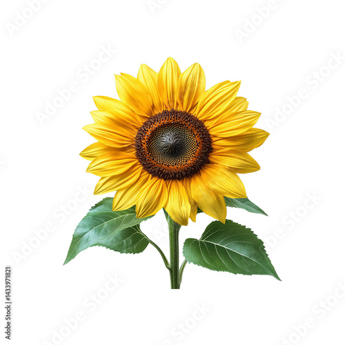 © PixelNest, Obraz premium Yellow sunflower with green leaves isolated on transparent background