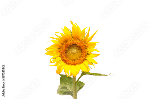 Obraz premium Yellow sunflower with leaf isolated on white background.