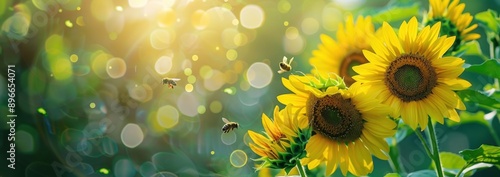 © SKIMP Art, Fototapeta premium yellow sunflowers on the right side of an out-of-focus background, with some bees flying around them Generative AI