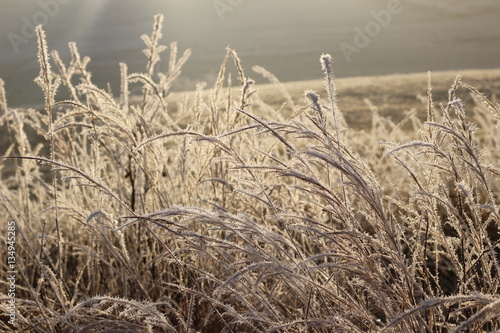 © atekram, Fototapeta premium Yellow sunny frozen grass detail