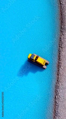 © Grapy Media, Fototapeta premium Yellow Tractor Vehicle in Azure Waterway Alongside Stony Shoreline Overhead View with Reflective Shadow