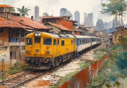 © btiger, Fototapeta premium Yellow Train on Urban Railway with Red Roof Houses