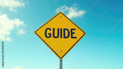 © MetaPixel, Naklejka premium Yellow transportation sign featuring the word guide against a blue sky background.