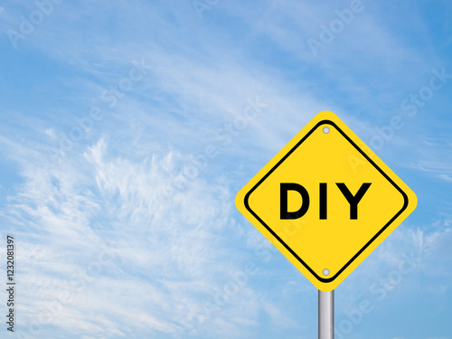 Fototapeta premium Yellow transportation sign with word DIY (abbreviation of do it yourself) on blue color sky background