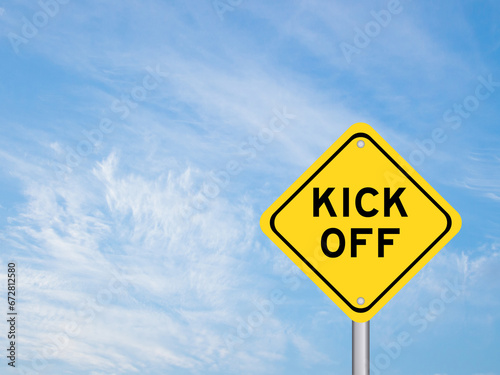 Naklejka premium Yellow transportation sign with word kick off on blue color sky background